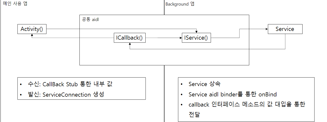 사용자에게 보여지는 앱의 실행중인 Activity 와 Background에서 기능을 동작할 앱의 Service 그리고 aidl을 통한 IService 와 ICallback 이렇게 최소 4개의 Class가 필요하게 됩니다.